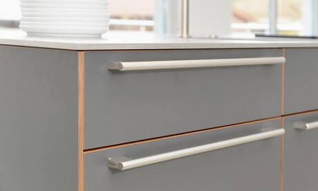 Aber auch Quarzstein ist in 12 mm Stärke zu haben, nicht nur in 38 mm. Edle Dünnplattenoptik gibt es aber auch als hochwertige Schichtstoff-Vollkernplatte mit melamingebundenem Hochdrucklaminat.