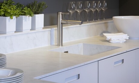 Vielleicht ist es Ihnen schon in der ein oder anderen Einrichtungszeitschrift oder in einer Küchenausstellung aufgefallen: In Designküchen wird häufig darauf verzichtet, die Arbeitsplatte über die Küchenunterschränke überstehen zu lassen, besonders häufig dann, wenn extradünne Arbeitsplatten verwendet wurden. Das sieht zugegeben um einiges schicker aus, birgt aber natürlich den Nachteil, dass wenn Flüssigkeiten beim Hantieren heruntertropfen, sie auch an den Schranktüren landen werden. Steht die Arbeitsplatte wenige Zentimeter über, geschieht dies nicht so schnell, und es lassen sich auch Krümel und Schnippelreste um einiges leichter in den unterhalb der Kante gehaltenen Mülleimer wischen.