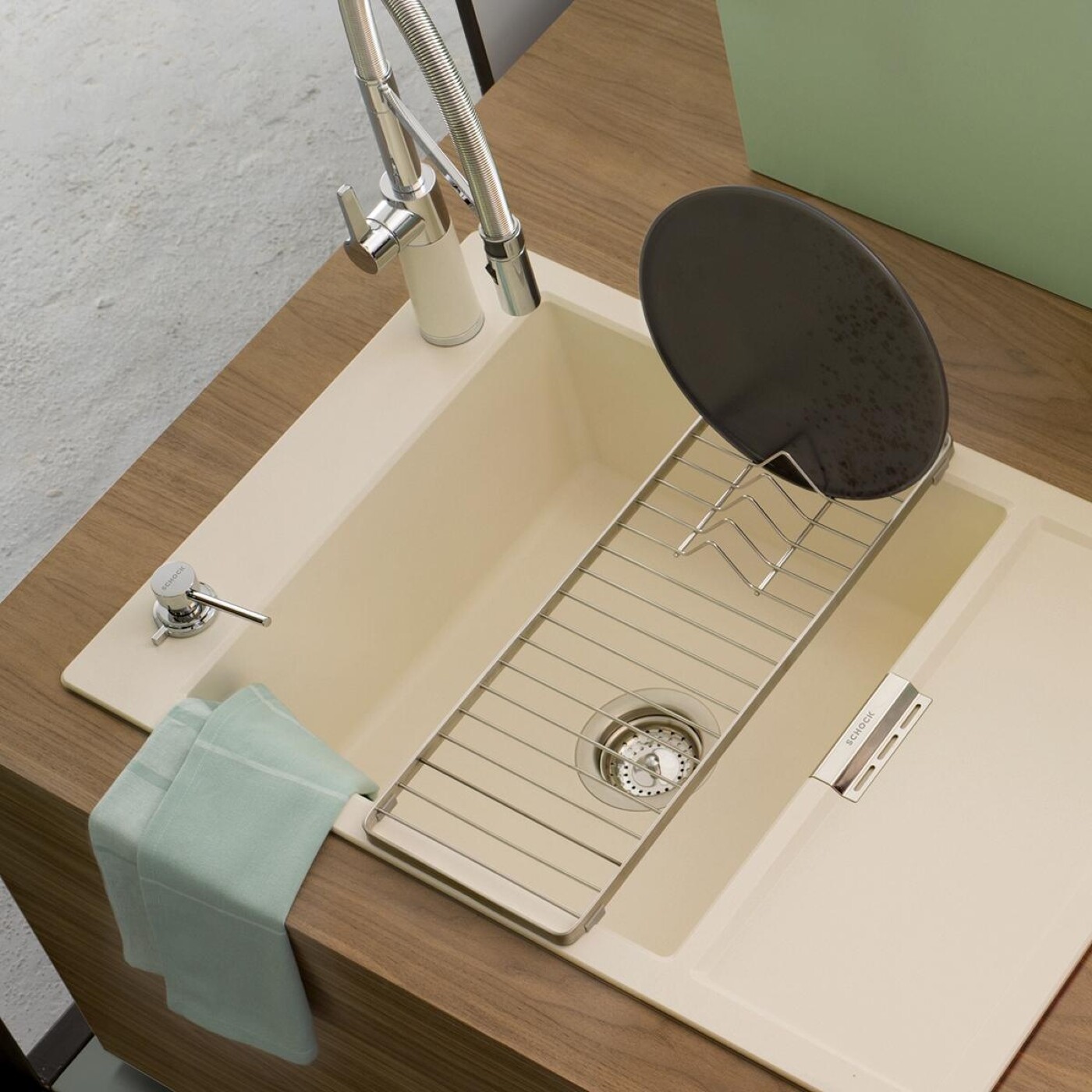 Einige moderne Spülbecken kommen dafür mit drei Bohrlöchern aus der Fertigung: Ein Loch für die Armatur, eines für die Exzenter-Steuerung und ein drittes Loch für den Seifenspender. Vom Spülenhersteller Schock gibt es sogar einen Einbau-Spülmittelspender, der beides kann: den Abfluss verschließen und Spülmittel spenden. Dafür ist unten am Gehäuse ein kleiner Hebel angebracht. Das Spülmittel kommt wie gewohnt per Druck von oben.