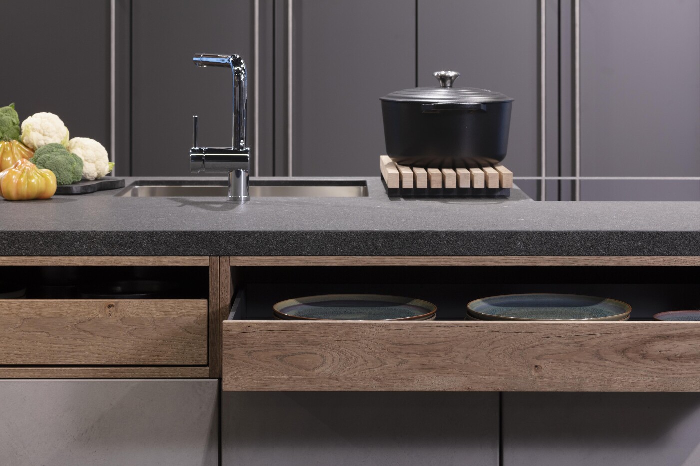 Schubkästen, die nach vorne zu einem Drittel oder Viertel offen sind – man sieht sie jetzt immer häufiger in neuen Küchen. Je nach Küchenhersteller werden sie als Auszugsregal oder Englischer Zug bezeichnet. Ihre Bauform ist typisch für Ladenmöbel, auch für alte Schreibtische, Rolladen- oder Wäscheschränke.