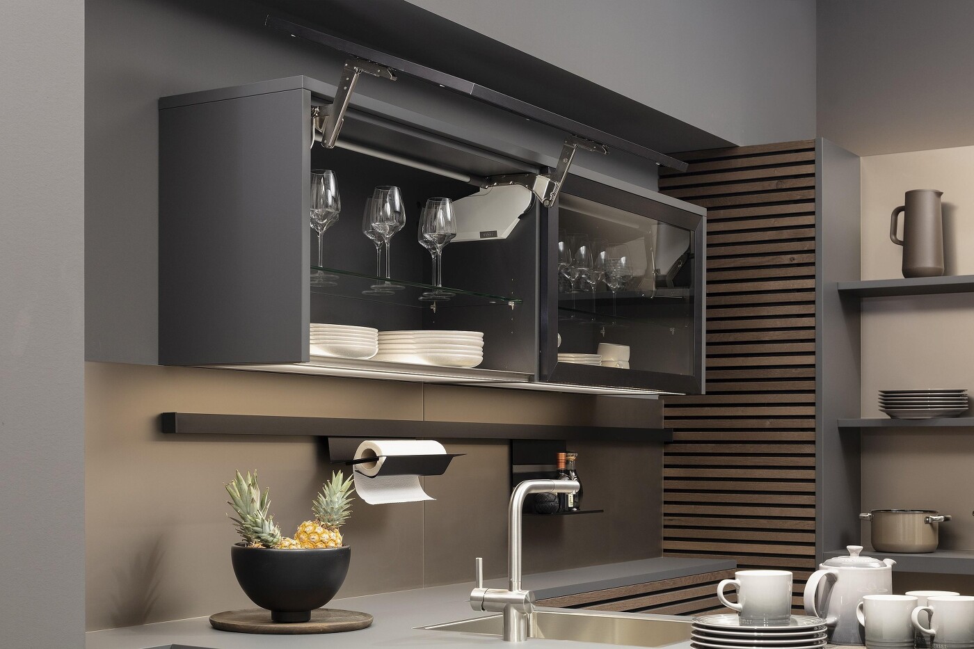 Bei Schränken oder Regalen, die über der Arbeitsfläche angebracht sind, sind Lichtbandsysteme für Leuchtstofflampen direkt unter den Hängeschränken ideal. Möglich sind Spots genauso wie Systeme zur großflächigen Beleuchtung. Angeboten werden auch Hängeschränke mit integrierter Beleuchtung über einem verglasten Boden, sodass der Küchenschrank zusätzlich von innen erstrahlt. Viele Lösungen lassen sich auch nachträglich noch installieren: Fragen Sie uns!
