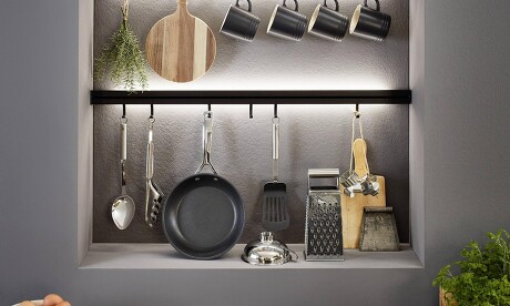 Auch bei den Reling-Systemen hat sich einiges getan, nicht nur in Bezug auf die Elemente zum Anhängen, Stellen oder Verstauen verschiedenster Küchenutensilien. Inzwischen kommen viele Wandstecksysteme mit indirekter LED-Beleuchtung, welche rück- oder unterseitig integriert ist.