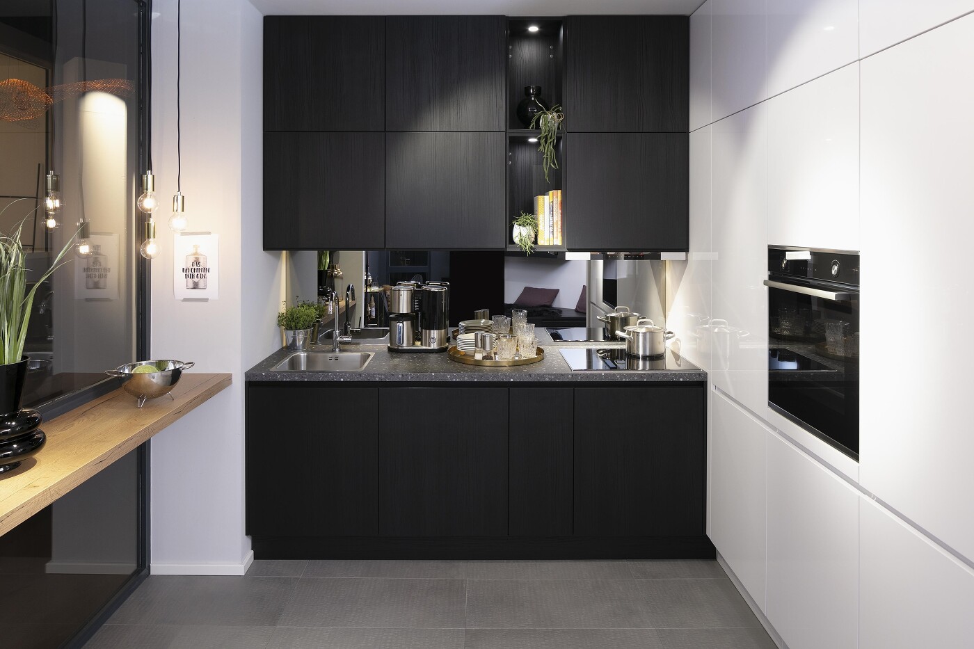 So schick kann eine Mini-Küche aussehen! Die grifflosen Fronten und die Kombination aus Hochglanz-Weiß und mattem Schwarz schinden wirklich Eindruck und sehen edel aus. Schmale Küchenspüle und schmales Kochfeld lassen Platz übrig für die Essensvorbereitung. Die verspiegelte Nischenrückwand trägt dazu bei, den Raum optisch größer wirken zu lassen.