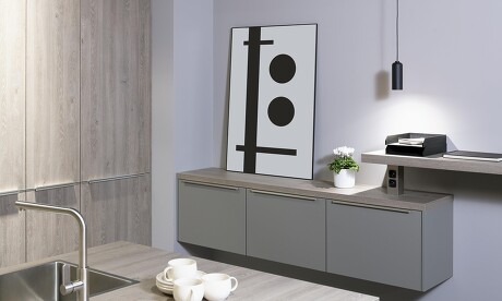 Die Optik der neuen, hängend montierten Sideboards erinnert nur noch entfernt an Küchenmöbel. Modern und lässig interpretiert sind sie bestens für den fließenden Übergang von Küche und Wohnraum geeignet. Grifflose Fronten sind besonders stilvoll. Je nach Art der restlichen Küchengestaltung passt Holzoptik genauso gut wie eine matte Farblackierung. Sanfte erdige Farben strahlen Wärme aus, Grautöne mehr Noblesse.