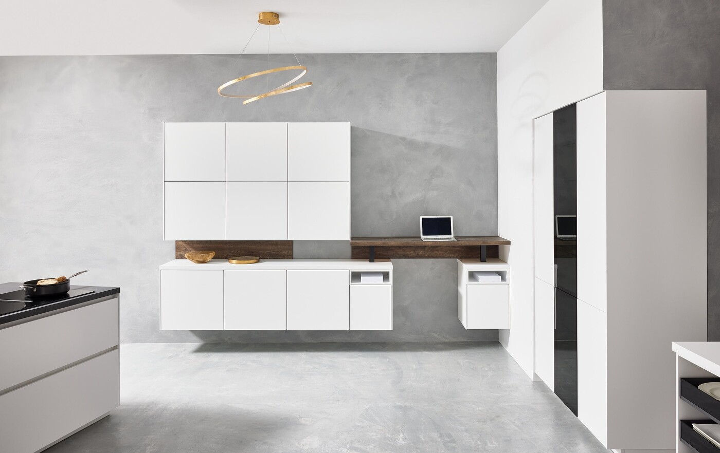 Der Stauraum- und Gerätehochschrank rechts wurde mittels Trockenbau quasi in die Wand versenkt und verliert damit seine Wuchtigkeit. Über Eck wirkt die reduzierte Ober-Unterschrank-Kombination durch die hängenden Unterschränke und das quadratische Frontenbild extra elegant. Ein gelungener Clou, diesen Aufbau mit einem kleinen Heimarbeitsplatz zu verbinden, woran man sieht: Für jeden Anwendungsfall gibt es mittlerweile die passenden Küchenmöbel.