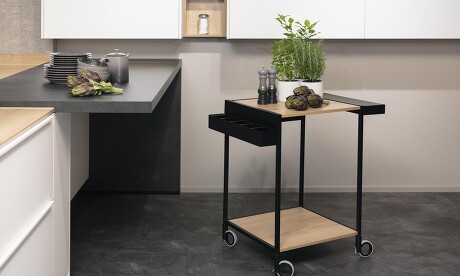 Schon gemerkt? – Die einstigen Teewagen sind längst wieder zurück, und das in den unterschiedlichsten Ausführungen: ganz offen oder auch mit Schubladen oder Schranktüren. Ideal, wenn so ein Teewagen sein eigenes „Carport“ unter der Arbeitsplatte bekommt, denn dann ist er schnell hervorgeholt und genauso schnell wieder aus dem Weg gerollt.