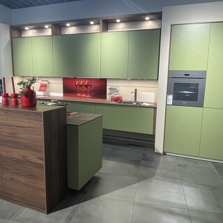 Design-Ausstellungsküche von Sachsenküchen – Mattlack Laub, Nussbaum, schwebende Unterschränke – Abverkauf
