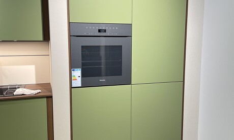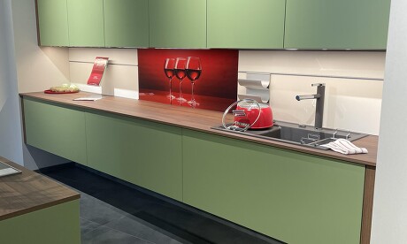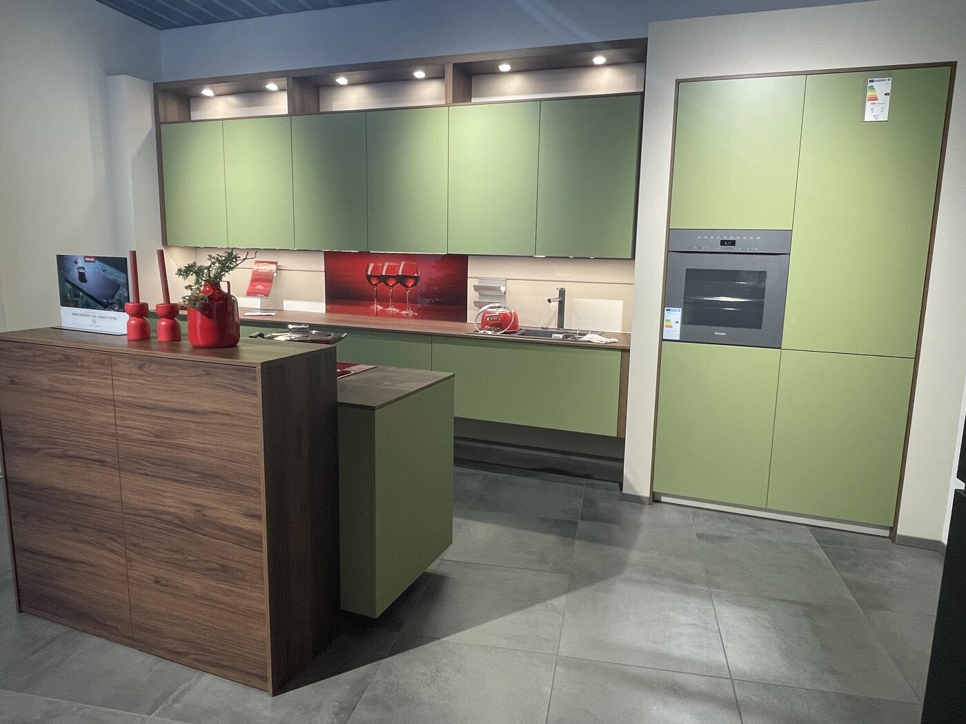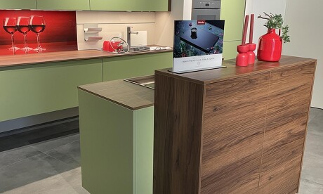Design-Ausstellungsküche von Sachsenküchen – Mattlack Laub, Nussbaum, schwebende Unterschränke – Abverkauf